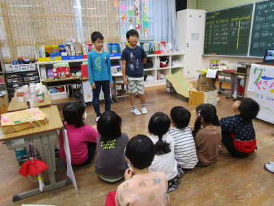 今日は朝の集会で6年生の2人が修学旅行の報告をしてくれました。